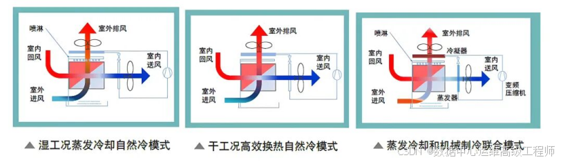 风侧间接蒸发冷却技术:主要用于冷却空气,将处理后的低温空气送入数据中心室内,为服务器 等设备降温。
